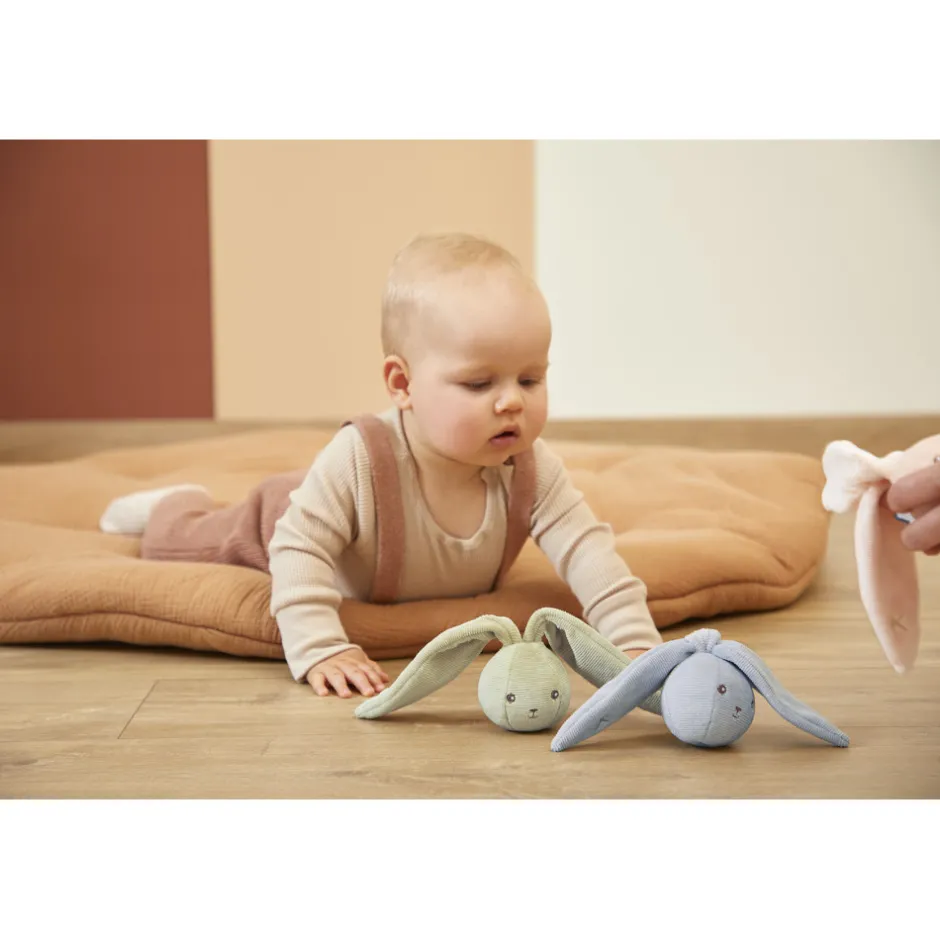 Cette balle hochet Lapinoo verte est une vraie pépite ! C’est un jouet tout en rondeur et facile à manipuler par les petites mains de bébé. Cet adorable hochet lapin est spécialement conçu pour divertir les tout-petits dès la naissance. Grâce à son grelot intégré, ce jouet d’éveil sensoriel stimule la curiosité de bébé lorsqu’il le secoue. Les grandes oreilles de lapin (16 cm) de cette balle en tissu Kaloo sont un véritable plus : elles permettent de l’accrocher facilement à la poussette, au cosy, au berceau ou même sur le sac à langer, pour suivre bébé partout où il va. Ainsi, votre enfant aura toujours son jouet préféré à portée de main ! Composée de velours, cette balle lapin est très douce au toucher, et offre une sensation agréable pour les petites mains potelées de bébé. Sa taille compacte de 6 cm de diamètre la rend facile à saisir et à manipuler. La ravissante balle hochet Lapinoo de couleur verte est un indispensable pour amuser votre bébé : elle favorise son développement sensoriel et sa coordination main-œil. La teinte naturelle et les textures stimulantes de cette balle pour bébé éveillent sa curiosité et encouragent son exploration. Ce jouet d’éveil tout doux est composé de velours et de rembourrage en polyester à base de plastique recyclé. Vous pouvez laver cette balle en machine à 30° en veillant à la laver séparément des autres articles. Il est recommandé de ne pas utiliser d’adoucissants, de détachants ou d’autres additifs afin de préserver la douceur et la qualité du jouet. Offrez à votre bébé des heures de jeu et de découverte avec l’adorable balle hochet Lapinoo vert ! Ce jouet en peluche tellement doux, facile à prendre en main, avec son grelot et ses grandes oreilles, est un compagnon de jeu parfait pour votre enfant.