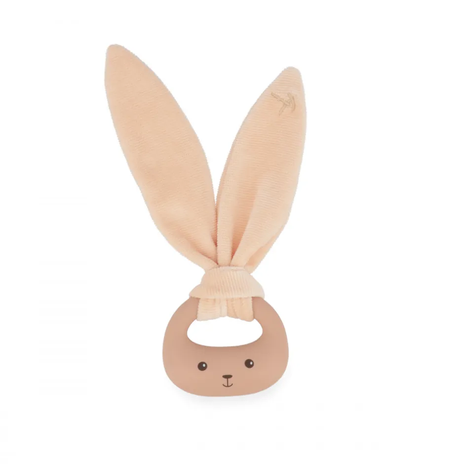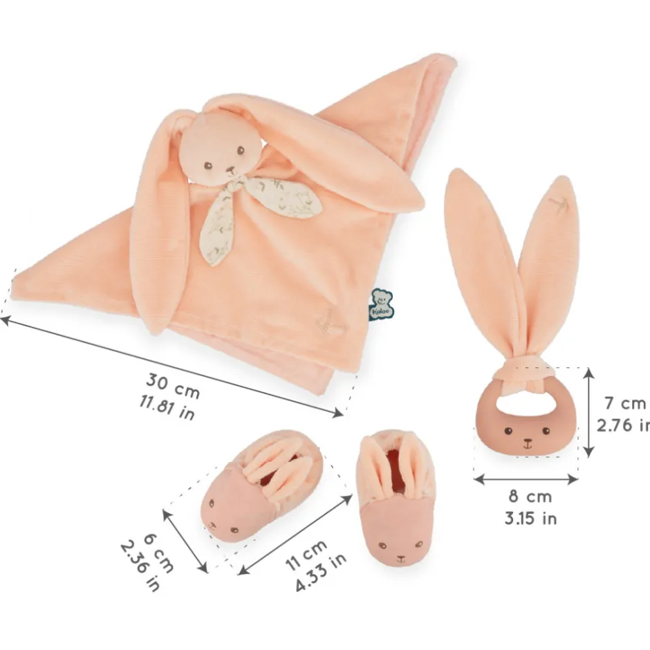 Fondez pour cet adorable coffret cadeau de naissance composé de 3 essentiels, dédiés à bébé. Ce coffret comprend un doudou lapin, un anneau de dentition en silicone et de petits chaussons lapin, le tout de couleur pêche.