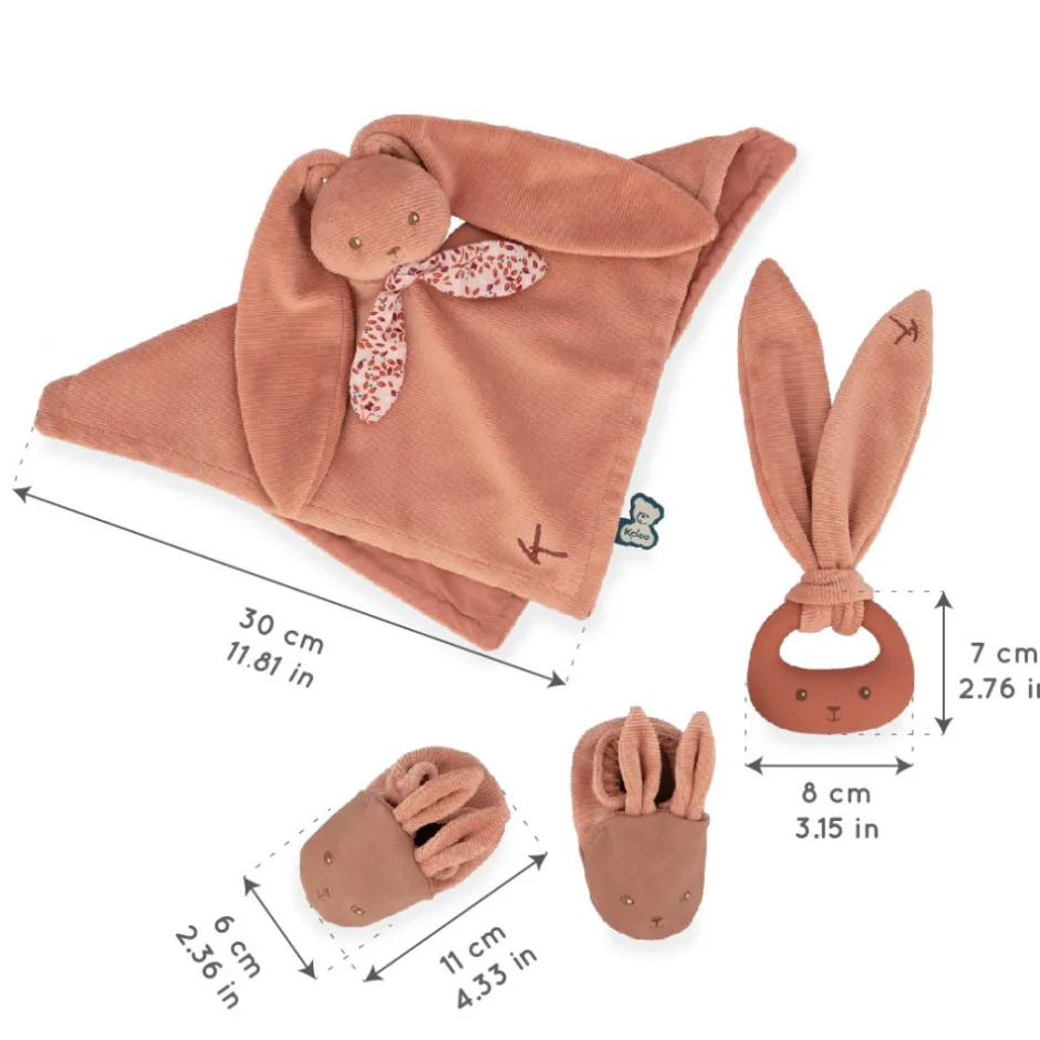 Offrez ce superbe coffret cadeau de naissance contenant 3 indispensables spécialement conçus pour bébé. Ce coffret comprend un doudou lapin, un anneau de dentition en silicone et de charmants chaussons lapin, tous dans une magnifique teinte terracotta.