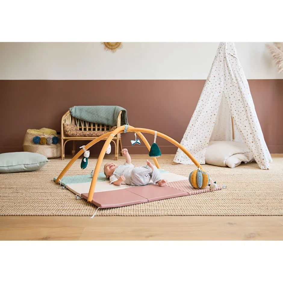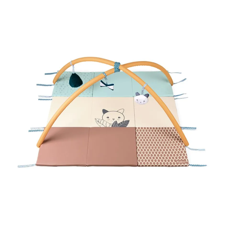 Bébé va découvrir tout un monde de surprises ! Avec ce tapis d’éveil évolutif et sensoriel, bébé s’éveille et développe ses sens, dès la naissance. Divisé en trois panneaux amovibles, une multitude de combinaisons sont possibles pour que ce tapis s’adapte toujours à bébé et l’accompagne tout au long de son développement au fil des mois voire des années ! Il est idéal pour créer un véritable parcours de motricité pour bébé. Des arches amovibles et des accessoires pensés spécialement pour développer les sens des petits sont inclus : un hochet en forme de chat, un nœud avec papier bruissant et une balle à attraper. Idéal pour aider au développement postural et locomoteur de votre enfant, ce tapis évolutif trouvera sa place dans son espace de jeu. Ferme et confortable, votre tout-petit va adorer passer du temps sur son tapis pour bouger, s’amuser et découvrir au quotidien ! Il prendra conscience de son corps dans l’espace, ce qui est essentiel dans son développement. Pensé pour stimuler tous les sens de bébé, ce tapis sensoriel permet de développer : la vue de bébé grâce à des motifs riches et des couleurs contrastées, l’ouïe avec des accessoires en papier bruissant, le toucher grâce à des matières et textures diverses, la préhension fine lorsqu’il saisit les jouets, et le développement postural en encourageant bébé à se déplacer et à explorer ! Pour satisfaire toute la famille, ce tapis modulable est en PVC pour le laver en toute facilité et pliable pour un transport facile et pratique. Ce tapis d’éveil évolutif fait partie de la gamme Stimuli de KALOO, développée en collaboration avec des psychomotriciens pour aider bébé à développer ses compétences sensori-motrices dès la naissance.